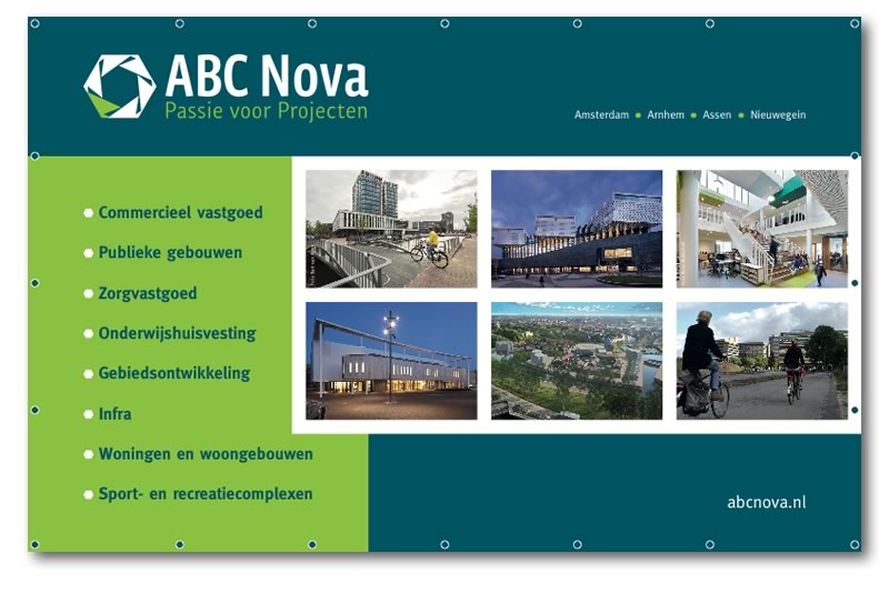 Een frame van steigerpijpen met daartussen een stevig doek waar in het kort de segmenten opstaan waar ABC Nova in opereerd. Ontworpen om makkelijk mee te nemen en op te zetten. Bright Design verzorgde het ontwerp.