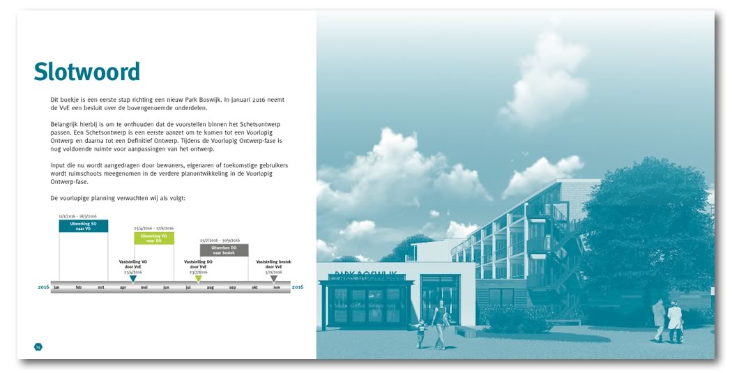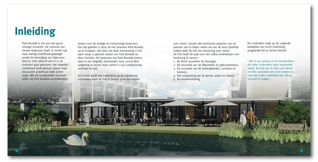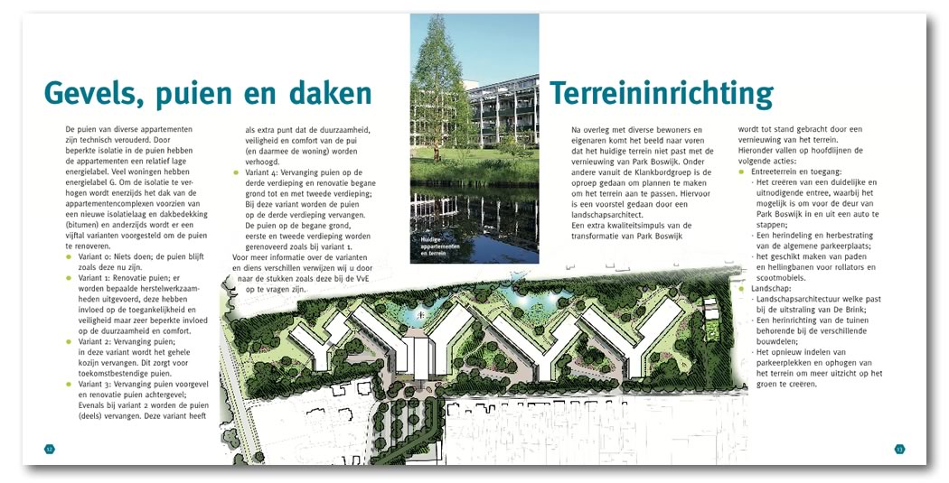 Deze brochure, ontworpen en vormgegeven door Bright Design, geeft een toelichting op de ingediende voorstellen die aangeboden zijn aan de VvE van Park Boswijk.