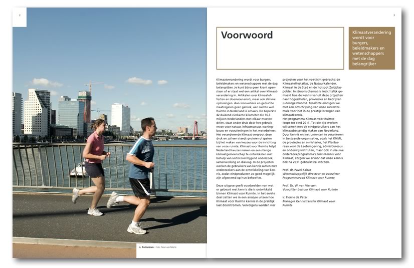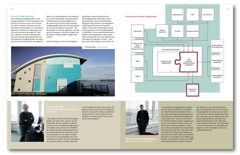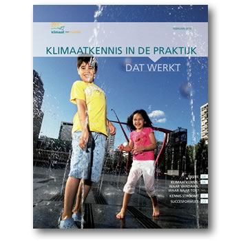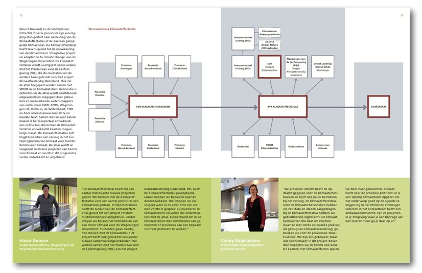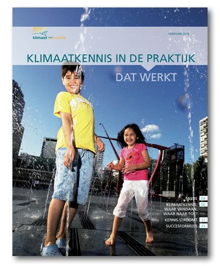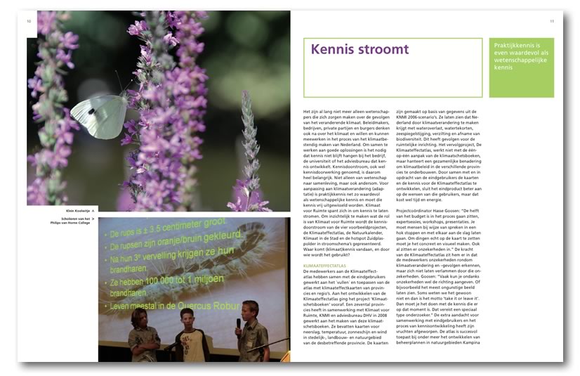 Deze uitgave geeft voorbeelden van wat er gebeurt met de kennis die is ontwikkeld binnen Klimaat voor Ruimte. In het eerste deel wordt een analyse uiteen gezet hoe Klimaat voor Ruimte kennis in de praktijk laat doorstromen. Vervolgens worden vier projecten voor het voetlicht gebracht. In stroomschema’s is inzichtelijk gemaakt hoe de kennis vanuit deze projecten naar hogescholen, provincies en bedrijven is doorgestroomd. Tenslotte eindigt het met een omschrijving van de succesformule voor het in de praktijk brengen van klimaatkennis. Bright Design zorgde voor het ontwerp en de realisatie van deze uitgave.