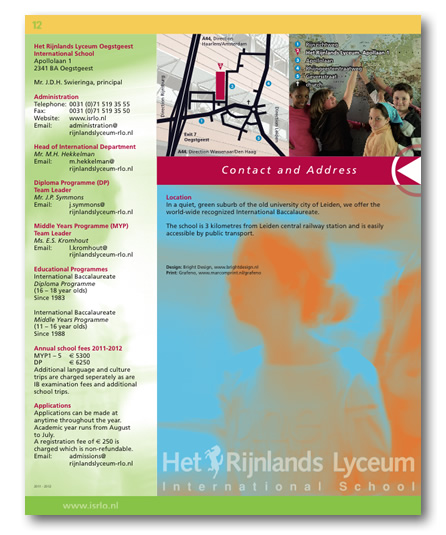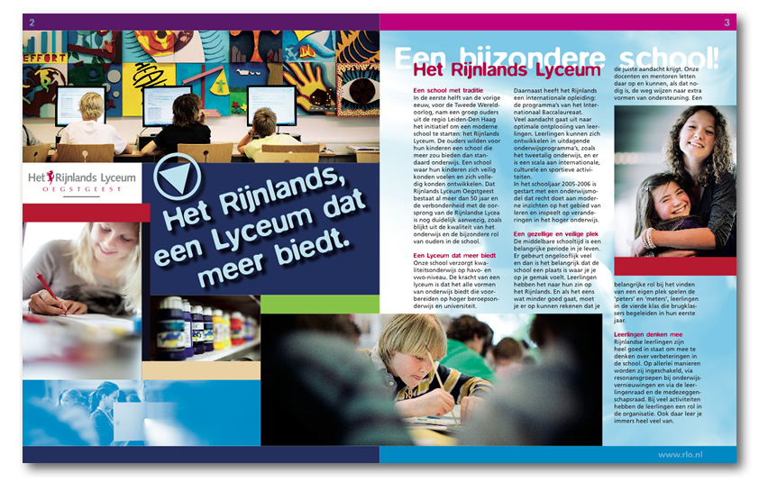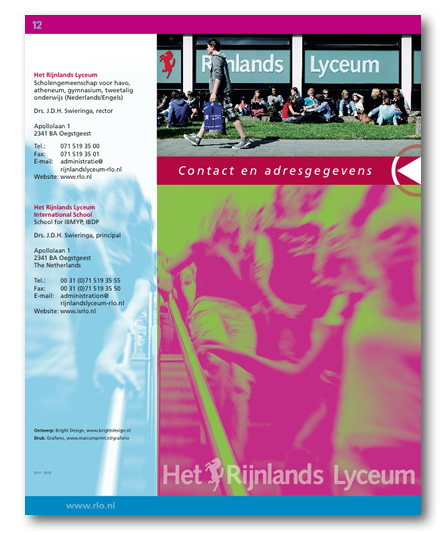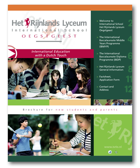 Het Rijnlands Lyceum in Oegstgeest verzorgt kwaliteitsonderwijs op havo- en vwo-niveau. Daarnaast heeft het Rijnlands Lyceum een internationale opleiding: de programma’s van het Internationaal Baccalaureaat. Bright Design verzorgt al een aantal jaren alle communicatie uitingen, van ontwerp tot gedrukt op de plank. Zo ook deze brochures.