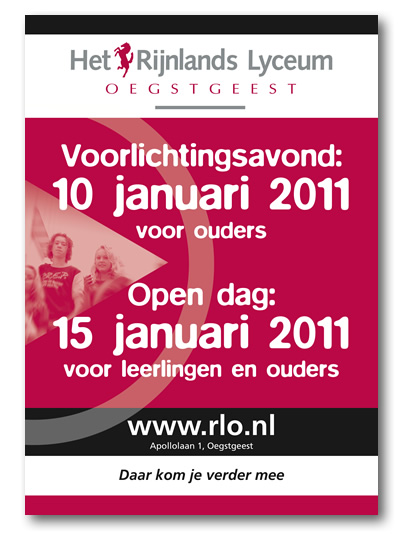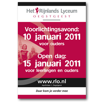 Het Rijnlands Lyceum laat zich tijdens de informatiedagen in januari overal zien. Ook op straat doormiddel van de bekende driehoekborden.