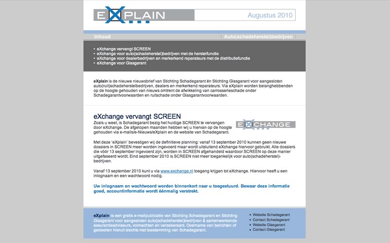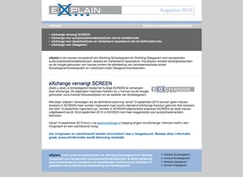 eXplain is de nieuwsbrief van Stichting Schadegarant en Stichting Glasgarant voor auto(schade)herstelbedrijven, glasherstellers, verzekeraars, volmachten en assurantieadviseurs. Via eXplain worden belanghebbenden op de hoogte gehouden van nieuws omtrent de afwikkeling van carrosserieschade onder Schadegarantvoorwaarden en ruitschade onder Glasgarantvoorwaarden. Bright Design heeft deze nieuwsbrief ontwikkeld en verstuurt wanneer gewenst de nieuwsbrief per email naar alle belanghebbenden. De nieuwsbrief wordt ook door ons op het internet geplaatst.