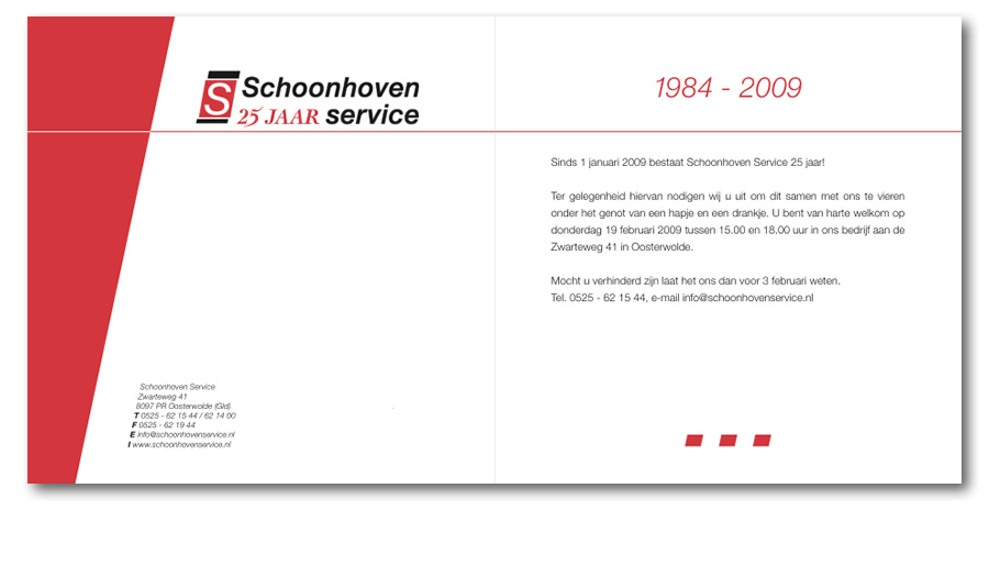 Schoonhoven Service is een bedrijf dat gespecialeerd is in verkoop en reparatie van zowel grondverzet- als landbouwmachines. Het bedrijf is 1 januari 1984 opgericht en in 2009 vierde het zijn 25-jarig bestaan. Bright Design mocht als goede buur de uitnodiging verzorgen.
