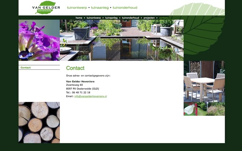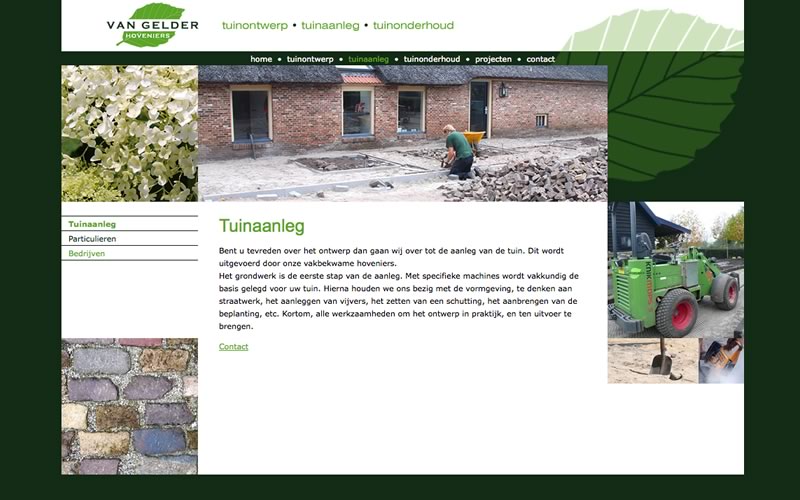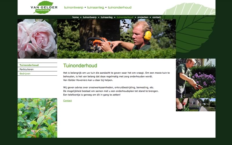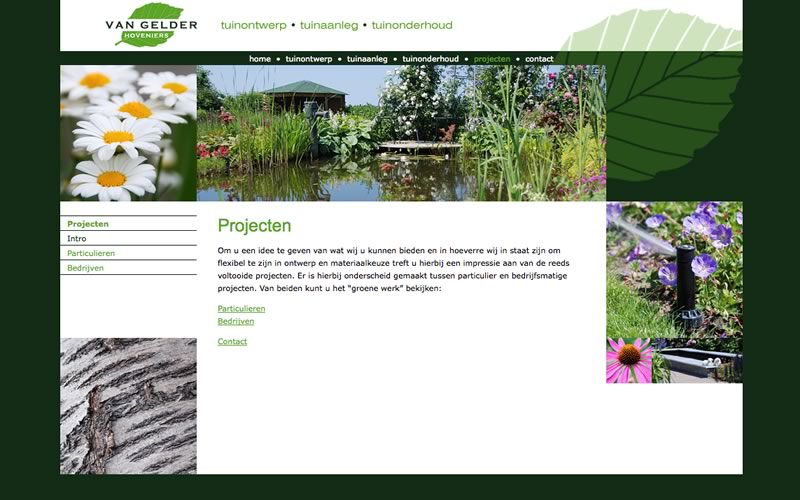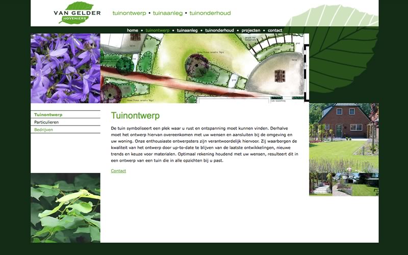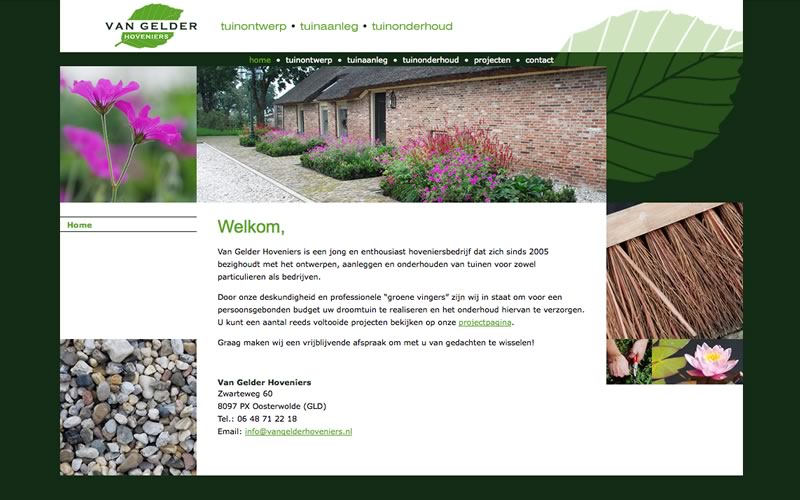 Geheel in stijl met de huisstijl en de folder heeft Bright Design voor Van Gelder Hoveniers ook de website verzorgd. Geregeld trekken wij er op uit om alle bestaande en nieuwe projecten te fotograferen. Oude foto's worden dan vervangen voor de nieuwe. Zo zorgen wij ervoor dat de site altijd up-to-date is.